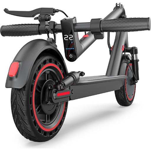 The i8 is a compact commuter scooter designed for short-to-mid range travel. Its 350 W motor reaches 18 mph and the 187 Wh battery covers around 12 miles. Dual braking (disc + EABS) ensures safe stops, and 8.5-inch pneumatic tires absorb shocks for a comfortable ride. At just 26.4 lbs, it’s one of the most portable scooters on this list and folds quickly for carrying or storage.