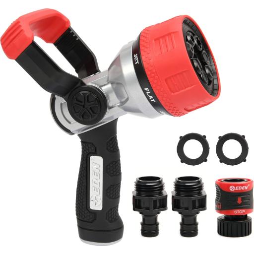 The Eden 96806 offers seven spray modes and comes with a quick-connect starter set for hassle-free switching. Its zinc alloy construction resists wear, while the honeycomb grip provides comfort and slip resistance. The large on/off handle is easy to operate, even with gloves.